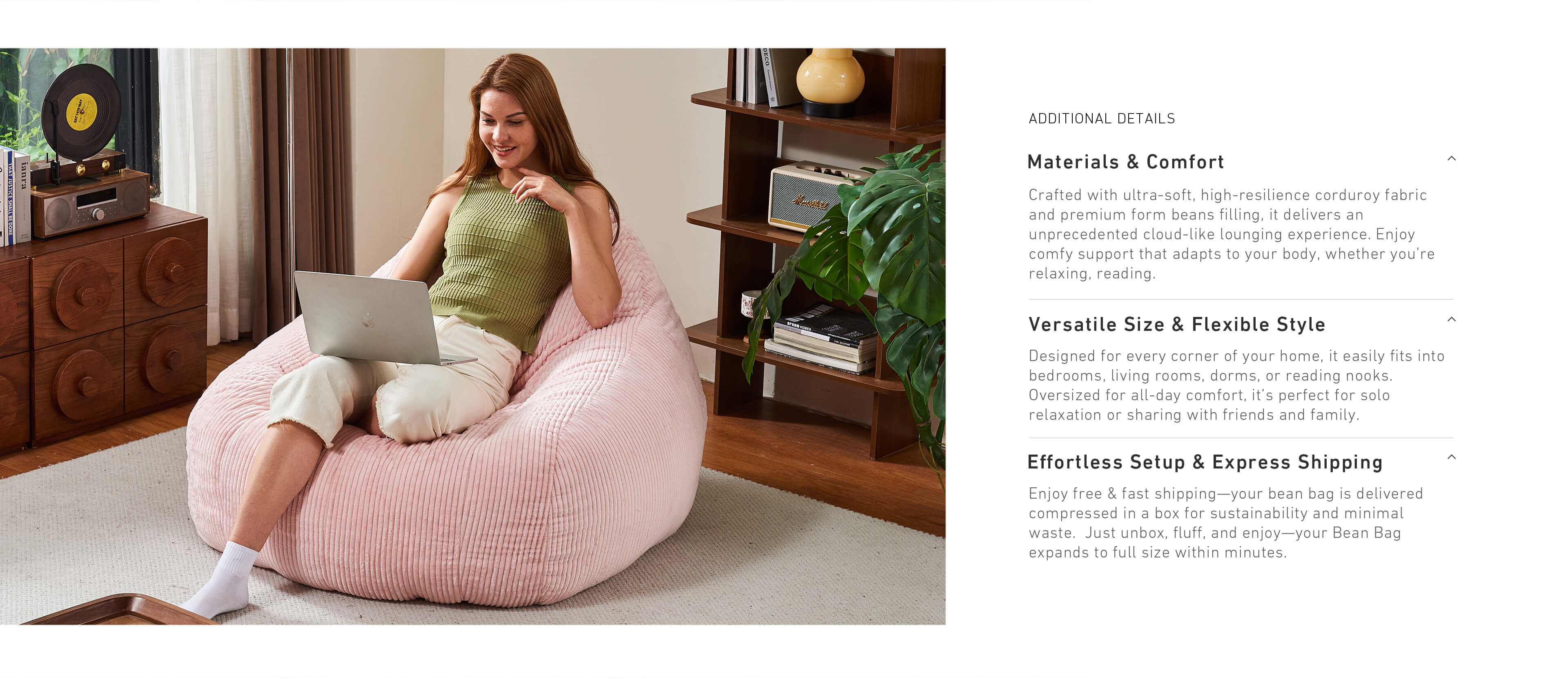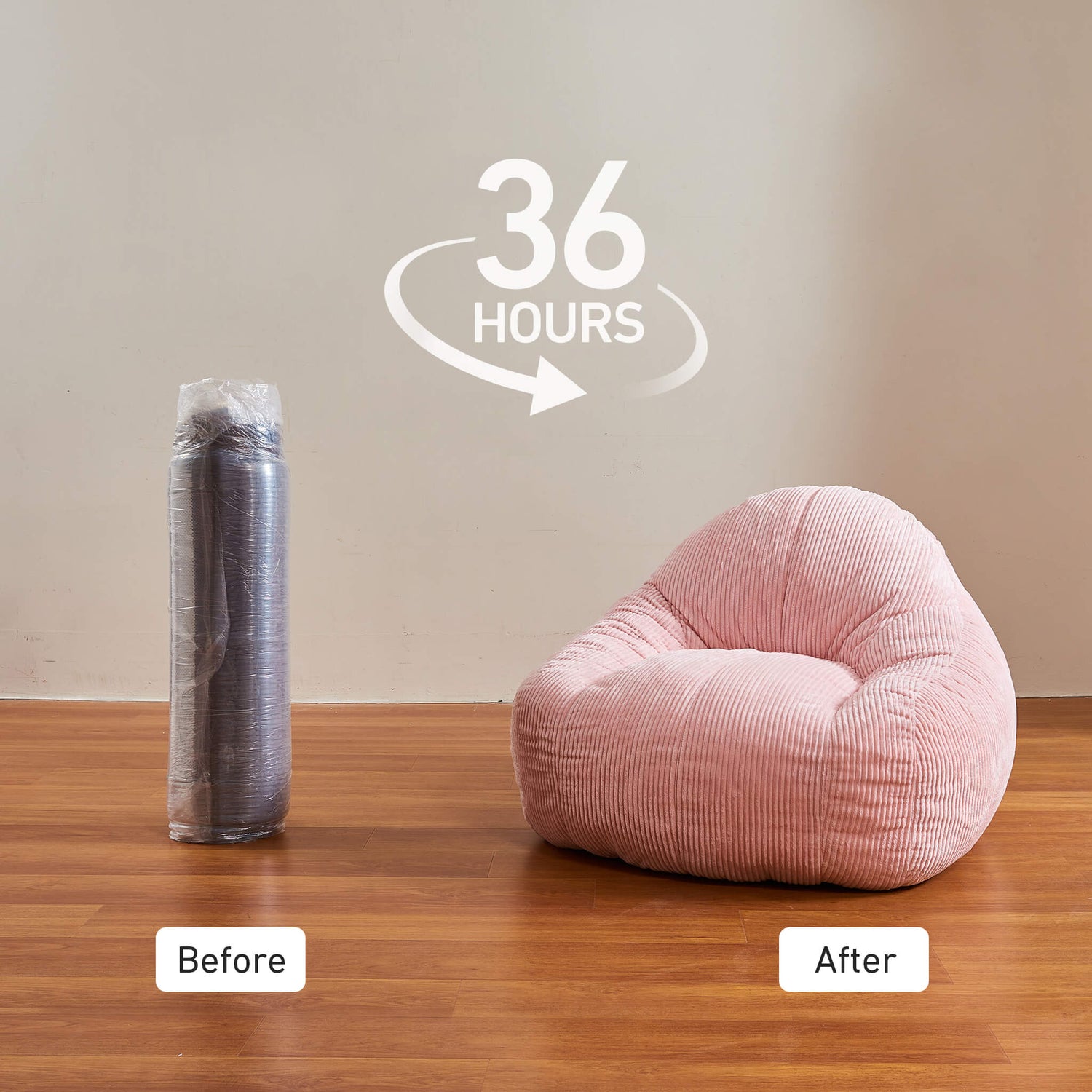 Engineered with space-saving vacuum packaging, the Zoovee Oversized Bean Bag ships compressed & unfold effortlessly. Once unpacked, it unfurls to its full jumbo size (44.8″ × 41.7 ″) in just under three minutes, no tools or effort required. Built with premium high-density foam beads that bounce back every time, it locks in structural support and cloud-like comfort for years to come.